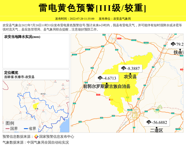 农安县气象台2022年7月20日11时35分发布雷电黄色预警信号:预计未来6小时内,我县有雷电天气,并可能伴有短时强降水或冰雹等强对流天气,县应急管理局、县气象局联合提醒,注意做好预防工作。 信息来源:国家预警信息发布中心; 发布单位:农安县气象局。