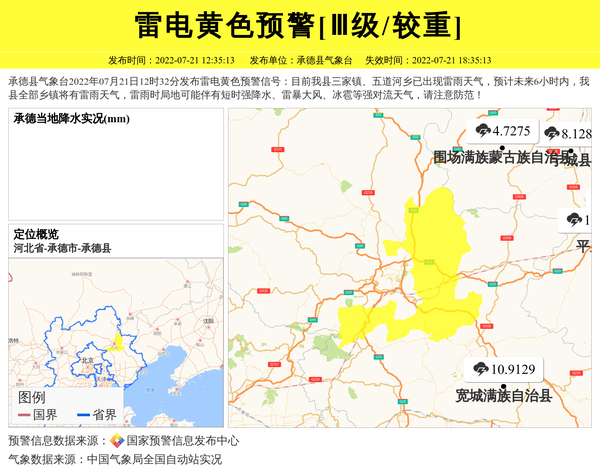 承德县气象台2022年07月21日12时32分发布雷电黄色预警信号:目前我县三家镇、五道河乡已出现雷雨天气,预计未来6小时内,我县全部乡镇将有雷雨天气,雷雨时局地可能伴有短时强降水、雷暴大风、冰雹等强对流天气,请注意防范! 信息来源:国家预警信息发布中心; 发布单位:承德县气象台。