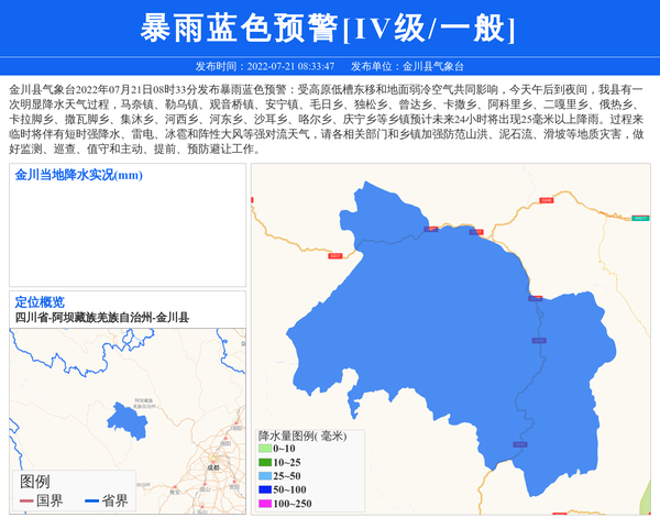 金川县气象台发布暴雨蓝色预警[IV级/一般]