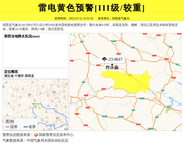 郧西县气象台2022年07月21日23时49分发布雷电黄色预警信号:预计未来6小时,郧西县关防、槐树、湖北口及周边乡镇有雷电活动,雨量30-50毫米,阵风7-9级,请注意防范。 信息来源:国家预警信息发布中心; 发布单位:郧西县气象台。