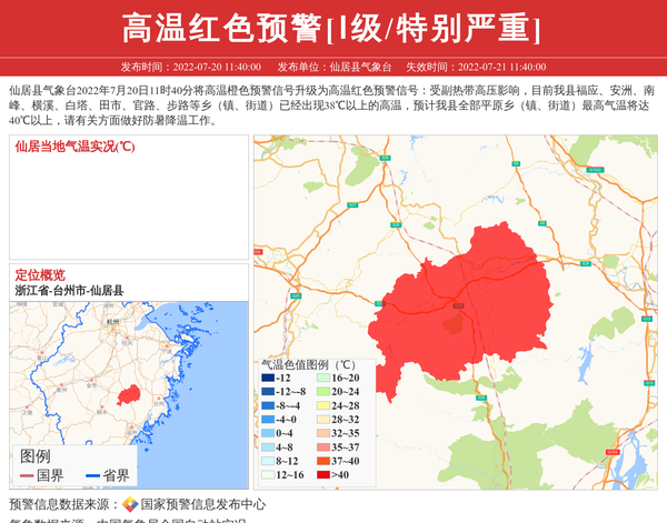仙居县气象台2022年7月20日11时40分将高温橙色预警信号升级为高温红色预警信号:受副热带高压影响,目前我县福应、安洲、南峰、横溪、白塔、田市、官路、步路等乡(镇、街道)已经出现38℃以上的高温,预计我县全部平原乡(镇、街道)最高气温将达40℃以上,请有关方面做好防暑降温工作。 信息来源:国家预警信息发布中心; 发布单位:仙居县气象台。