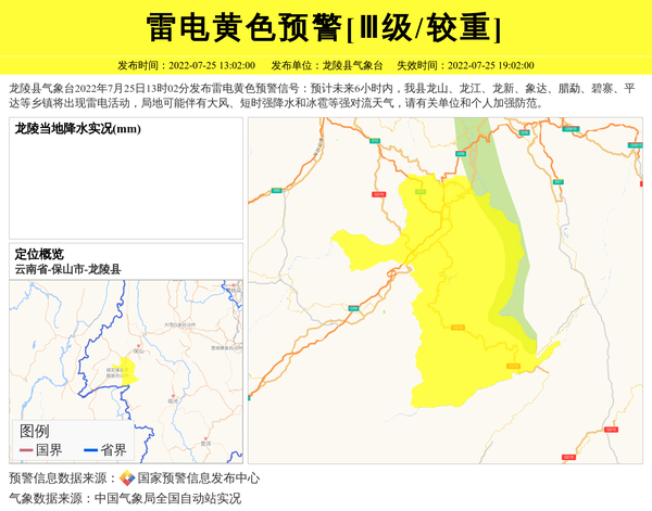 龙陵县气象台2022年7月25日13时02分发布雷电黄色预警信号:预计未来6小时内,我县龙山、龙江、龙新、象达、腊勐、碧寨、平达等乡镇将出现雷电活动,局地可能伴有大风、短时强降水和冰雹等强对流天气,请有关单位和个人加强防范。 信息来源:国家预警信息发布中心; 发布单位:龙陵县气象台。