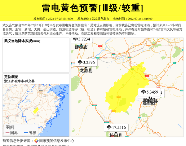 武义县气象台2022年07月25日13时16分发布雷电黄色预警信号:受对流云团影响,目前我县已出现雷电活动,预计未来1~3小时我县白姆、王宅、新宅、大田、壶山街道、熟溪街道等乡(镇、街道)将有较强雷电活动,并伴有短时强降雨和7-9级雷雨大风等强对流天气,请注意防范强对流天气对农业生产、户外活动、在建工程和疫情防控等带来的不利影响。 信息来源:国家预警信息发布中心; 发布单位:武义县气象台。