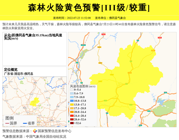 预计未来几天我县高温晴热,天气干燥,森林火险等级较高,佛冈县气象台7月23日11时48分发布森林火险黄色预警信号,请注意森林防火和家居用火安全。 信息来源:国家预警信息发布中心; 发布单位:佛冈县气象台。