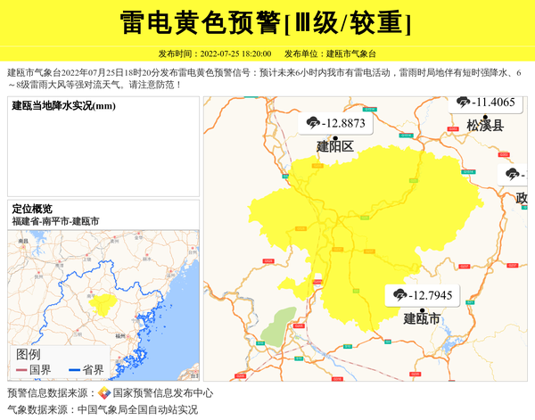 建瓯市气象台2022年07月25日18时20分发布雷电黄色预警信号:预计未来6小时内我市有雷电活动,雷雨时局地伴有短时强降水、6~8级雷雨大风等强对流天气。请注意防范! 信息来源:国家预警信息发布中心; 发布单位:建瓯市气象台。
