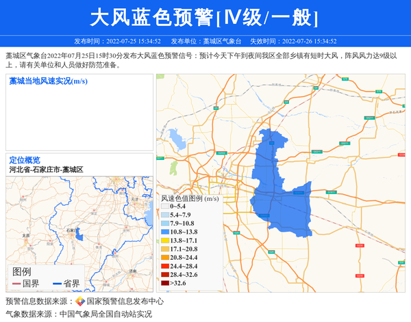 藁城区气象台2022年07月25日15时30分发布大风蓝色预警信号:预计今天下午到夜间我区全部乡镇有短时大风,阵风风力达9级以上,请有关单位和人员做好防范准备。 信息来源:国家预警信息发布中心; 发布单位:藁城区气象台。