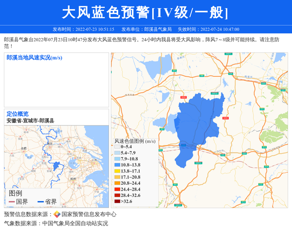 郎溪县气象台2022年07月23日10时47分发布大风蓝色预警信号。24小时内我县将受大风影响,阵风7~8级并可能持续。请注意防范! 信息来源:国家预警信息发布中心; 发布单位:郎溪县气象局。