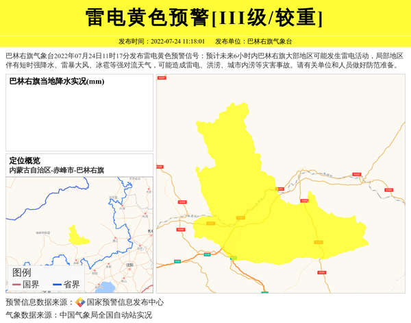 巴林右旗气象台2022年07月24日11时17分发布雷电黄色预警信号:预计未来6小时内巴林右旗大部地区可能发生雷电活动,局部地区伴有短时强降水、雷暴大风、冰雹等强对流天气,可能造成雷电、洪涝、城市内涝等灾害事故。请有关单位和人员做好防范准备。 信息来源:国家预警信息发布中心; 发布单位:巴林右旗气象台。