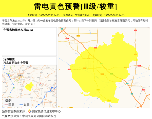 宁晋县气象台2022年07月27日12时03分发布雷电黄色预警信号:预计27日下午到夜间,我县全部乡镇有雷阵雨天气,局地伴有短时强降水、短时大风。请防范! 信息来源:国家预警信息发布中心; 发布单位:宁晋县气象台。