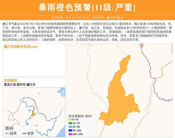 嫩江市气象台2022年7月27日07时50分发布暴雨橙色预警信号:过去1小时联兴乡已出现30.2毫米降水,预计未来3小时内联兴乡、长江乡、海江镇、多宝山镇、霍龙门镇降雨将达50毫米以上,嫩江镇、临江乡、前进镇、长福镇未来3小时内仍有15~25毫米降雨,降雨同时局地伴有雷电、大风等强对流天气。请有关单位和个人注意做好预防工作。防御指南:1.政府及相关部门按照职责做好防暴雨应急工作;2.切断有危险的室外电源,暂停户外作业;3.处于危险地带的单位应当停课、停业,采取专门措施保护已到校学生、幼儿和其他上班人员的安全;4.做好城市、农田的排涝,注意防范可能引发的山洪、滑坡、泥石流等灾害。 信息来源:国家预警信息发布中心; 发布单位:嫩江市气象台。