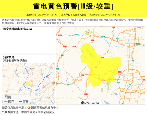 武安市气象台2022年07月27日13时54分发布雷电黄色预警信号:预计今天下午到夜间我市全部乡镇将出现雷雨天气,雷雨时局地有短时强降水、短时大风等强对流天气,请有关单位和人员做好防范。 信息来源:国家预警信息发布中心; 发布单位:武安市气象台。