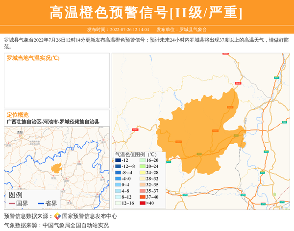 罗城县气象台2022年7月26日12时14分更新发布高温橙色预警信号:预计未来24小时内罗城县将出现37度以上的高温天气,请做好防范。 信息来源:国家预警信息发布中心; 发布单位:罗城县气象台。