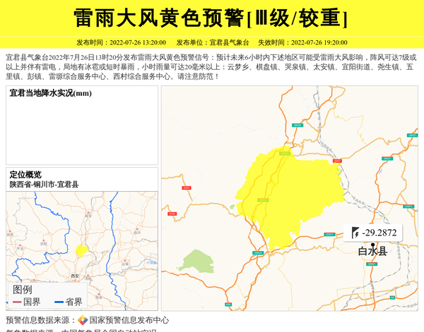 宜君县气象台2022年7月26日13时20分发布雷雨大风黄色预警信号:预计未来6小时内下述地区可能受雷雨大风影响,阵风可达7级或以上并伴有雷电,局地有冰雹或短时暴雨,小时雨量可达20毫米以上:云梦乡、棋盘镇、哭泉镇、太安镇、宜阳街道、尧生镇、五里镇、彭镇、雷塬综合服务中心、西村综合服务中心。请注意防范! 信息来源:国家预警信息发布中心; 发布单位:宜君县气象台。