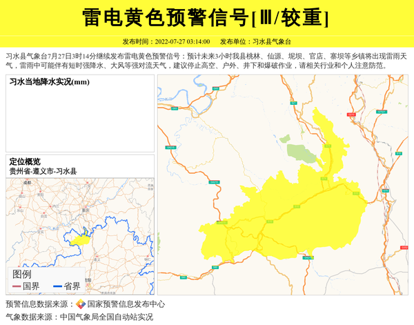 习水县气象台7月27日3时14分继续发布雷电黄色预警信号:预计未来3小时我县桃林、仙源、坭坝、官店、寨坝等乡镇将出现雷雨天气,雷雨中可能伴有短时强降水、大风等强对流天气,建议停止高空、户外、井下和爆破作业,请相关行业和个人注意防范。 信息来源:国家预警信息发布中心; 发布单位:习水县气象台。