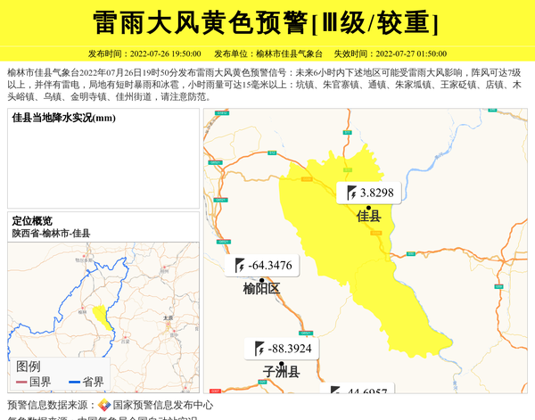 榆林市佳县气象台2022年07月26日19时50分发布雷雨大风黄色预警信号:未来6小时内下述地区可能受雷雨大风影响,阵风可达7级以上,并伴有雷电,局地有短时暴雨和冰雹,小时雨量可达15毫米以上:坑镇、朱官寨镇、通镇、朱家坬镇、王家砭镇、店镇、木头峪镇、乌镇、金明寺镇、佳州街道,请注意防范。 信息来源:国家预警信息发布中心; 发布单位:榆林市佳县气象台。