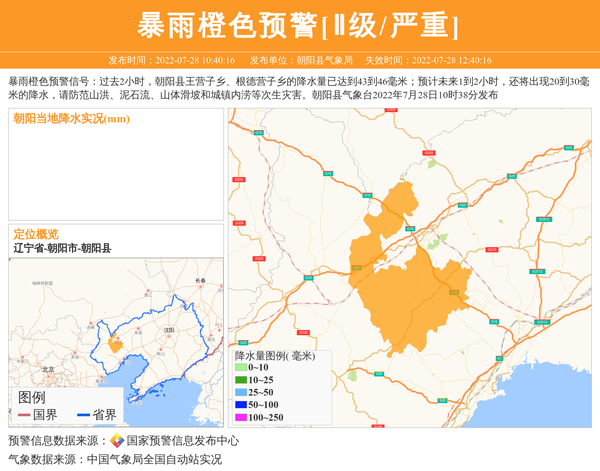 暴雨橙色预警信号:过去2小时,朝阳县王营子乡、根德营子乡的降水量已达到43到46毫米;预计未来1到2小时,还将出现20到30毫米的降水,请防范山洪、泥石流、山体滑坡和城镇内涝等次生灾害。朝阳县气象台2022年7月28日10时38分发布 信息来源:国家预警信息发布中心; 发布单位:朝阳县气象局。