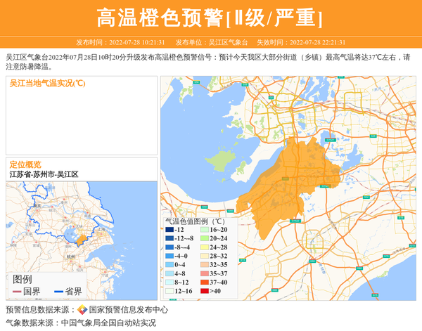 吴江区气象台2022年07月28日10时20分升级发布高温橙色预警信号:预计今天我区大部分街道(乡镇)最高气温将达37℃左右,请注意防暑降温。 信息来源:国家预警信息发布中心; 发布单位:吴江区气象台。