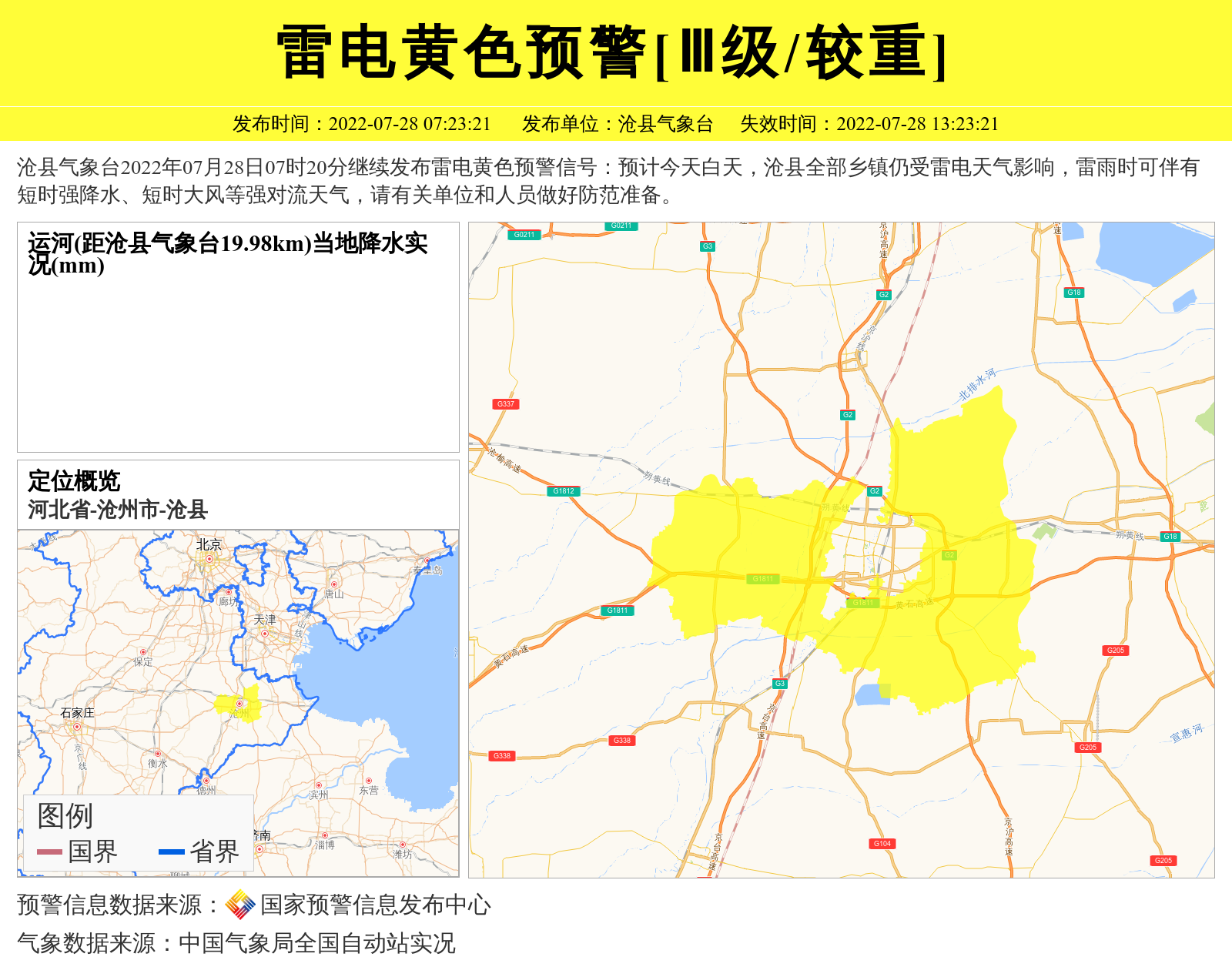 沧县气象台2022年07月28日07时20分继续发布雷电黄色预警信号:预计今天白天,沧县全部乡镇仍受雷电天气影响,雷雨时可伴有短时强降水、短时大风等强对流天气,请有关单位和人员做好防范准备。 信息来源:国家预警信息发布中心; 发布单位:沧县气象台。