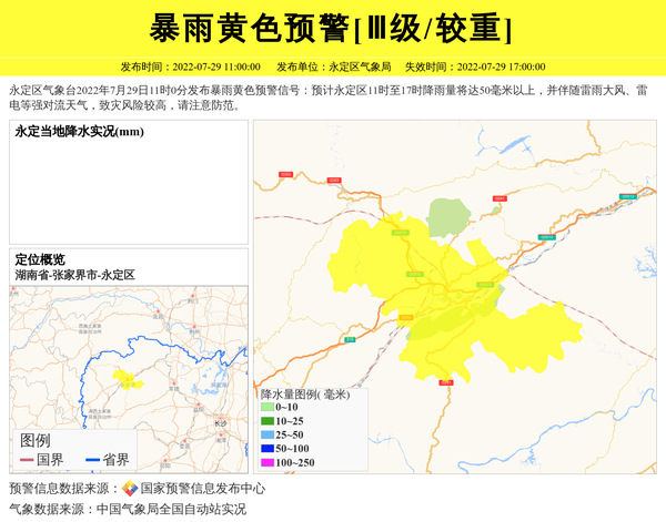 永定区气象台2022年7月29日11时0分发布暴雨黄色预警信号:预计永定区11时至17时降雨量将达50毫米以上,并伴随雷雨大风、雷电等强对流天气,致灾风险较高,请注意防范。 信息来源:国家预警信息发布中心; 发布单位:永定区气象局。