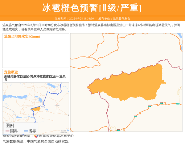 温泉县气象台2022年7月28日18时38分发布冰雹橙色预警信号:预计温泉县南部山区及沿山一带未来6小时可能出现冰雹天气,并可能造成雹灾,请有关单位和人员做好防范准备。 信息来源:国家预警信息发布中心; 发布单位:温泉县气象台。