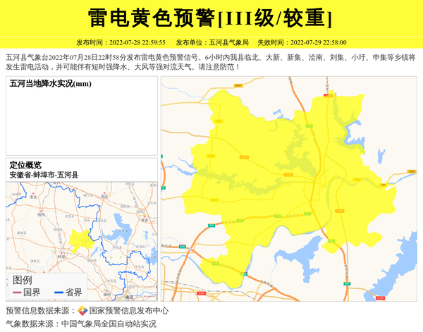 五河县气象台2022年07月28日22时58分发布雷电黄色预警信号。6小时内我县临北、大新、新集、浍南、刘集、小圩、申集等乡镇将发生雷电活动,并可能伴有短时强降水、大风等强对流天气。请注意防范! 信息来源:国家预警信息发布中心; 发布单位:五河县气象局。