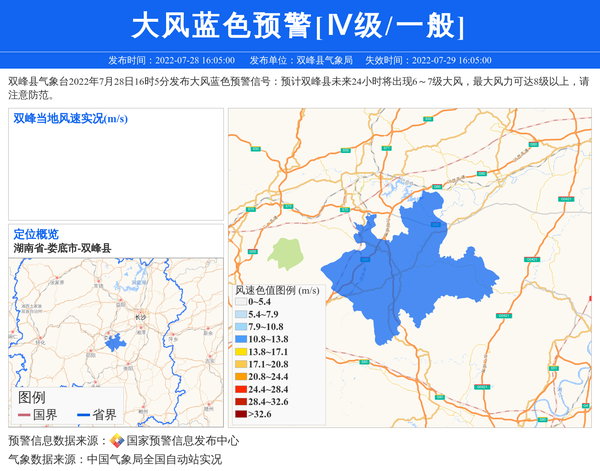 双峰县气象台2022年7月28日16时5分发布大风蓝色预警信号:预计双峰县未来24小时将出现6~7级大风,最大风力可达8级以上,请注意防范。 信息来源:国家预警信息发布中心; 发布单位:双峰县气象局。