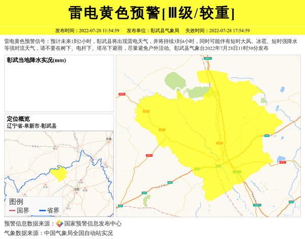 雷电黄色预警信号:预计未来1到2小时,彰武县将出现雷电天气,并将持续3到4小时,同时可能伴有短时大风、冰雹、短时强降水等强对流天气,请不要在树下、电杆下、塔吊下避雨,尽量避免户外活动。彰武县气象台2022年7月28日11时50分发布 信息来源:国家预警信息发布中心; 发布单位:彰武县气象局。