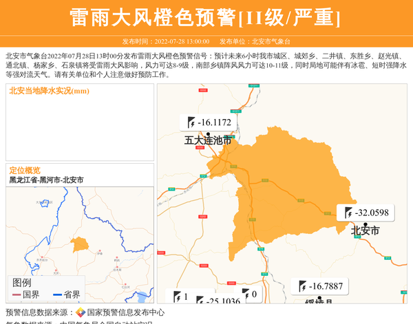 北安市气象台2022年07月28日13时00分发布雷雨大风橙色预警信号:预计未来6小时我市城区、城郊乡、二井镇、东胜乡、赵光镇、通北镇、杨家乡、石泉镇将受雷雨大风影响,风力可达8-9级,南部乡镇阵风风力可达10-11级,同时局地可能伴有冰雹、短时强降水等强对流天气。请有关单位和个人注意做好预防工作。 信息来源:国家预警信息发布中心; 发布单位:北安市气象台。