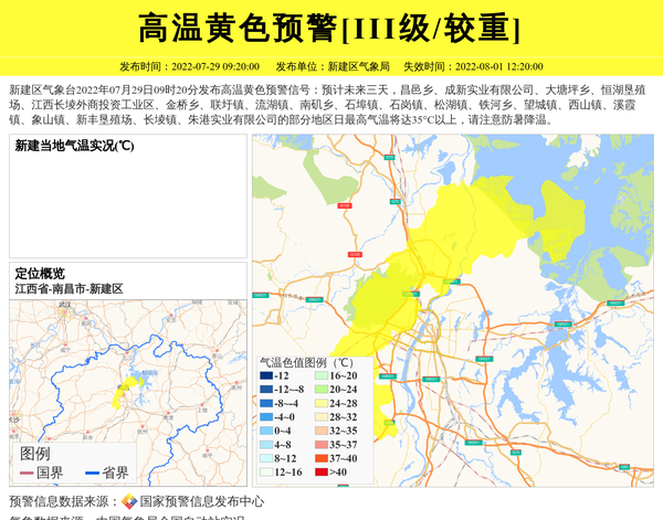 新建区气象台2022年07月29日09时20分发布高温黄色预警信号:预计未来三天,昌邑乡、成新实业有限公司、大塘坪乡、恒湖垦殖场、江西长堎外商投资工业区、金桥乡、联圩镇、流湖镇、南矶乡、石埠镇、石岗镇、松湖镇、铁河乡、望城镇、西山镇、溪霞镇、象山镇、新丰垦殖场、长堎镇、朱港实业有限公司的部分地区日最高气温将达35°C以上,请注意防暑降温。 信息来源:国家预警信息发布中心; 发布单位:新建区气象局。