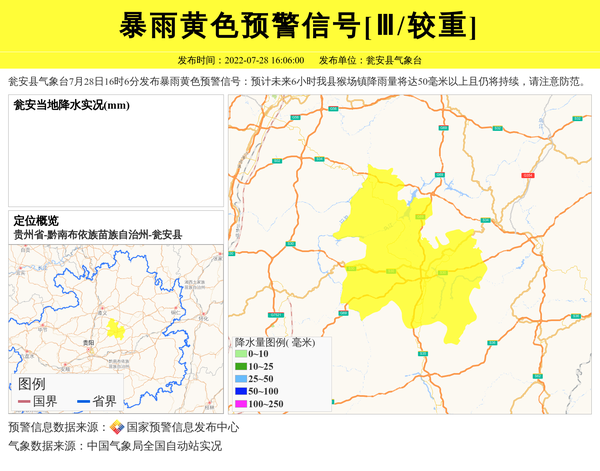 瓮安县气象台7月28日16时6分发布暴雨黄色预警信号:预计未来6小时我县猴场镇降雨量将达50毫米以上且仍将持续,请注意防范。 信息来源:国家预警信息发布中心; 发布单位:瓮安县气象台。