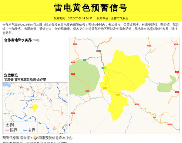 合作市气象台2022年07月29日14时24分发布雷电黄色预警信号:预计6小时内,卡加道乡、佐盖多玛乡、佐盖曼玛镇、勒秀镇、那吾镇、卡加曼乡、当周街道、通钦街道、伊合昂街道、坚木克尔街道等部分地区可能发生雷电活动,局地伴有冰雹或阵性大风,请注意防范。 信息来源:国家预警信息发布中心; 发布单位:合作市气象台。