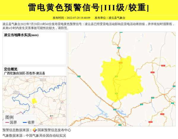凌云县气象台2022年7月28日18时40分发布雷电黄色预警信号:凌云县已经受雷电活动影响且雷电活动将持续,并伴有短时强降雨,未来6小时内发生灾害事故可能性比较大,请防范。 信息来源:国家预警信息发布中心; 发布单位:凌云县气象台。