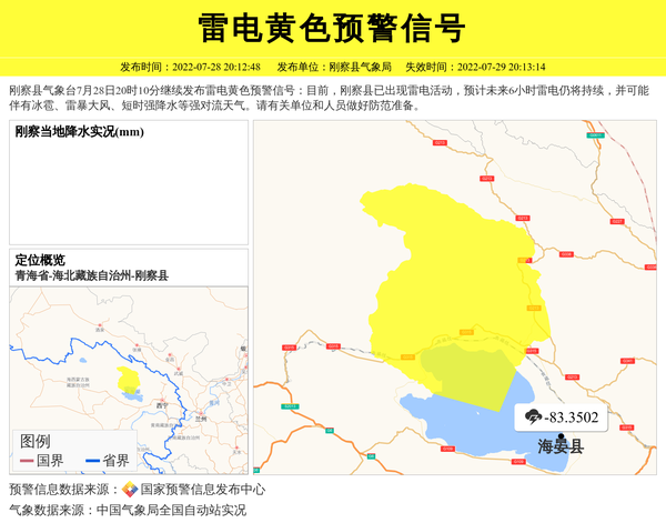 刚察县气象台7月28日20时10分继续发布雷电黄色预警信号:目前,刚察县已出现雷电活动,预计未来6小时雷电仍将持续,并可能伴有冰雹、雷暴大风、短时强降水等强对流天气。请有关单位和人员做好防范准备。 信息来源:国家预警信息发布中心; 发布单位:刚察县气象局。