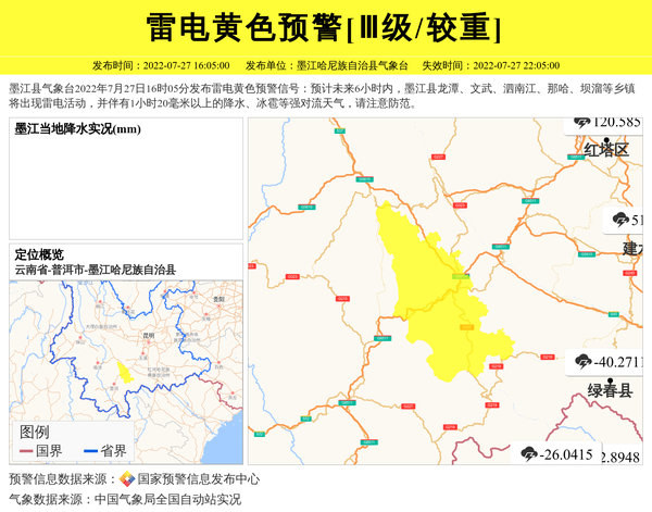 墨江县气象台2022年7月27日16时05分发布雷电黄色预警信号:预计未来6小时内,墨江县龙潭、文武、泗南江、那哈、坝溜等乡镇将出现雷电活动,并伴有1小时20毫米以上的降水、冰雹等强对流天气,请注意防范。 信息来源:国家预警信息发布中心; 发布单位:墨江哈尼族自治县气象台。