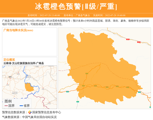 广南县气象台2022年7月28日13时40分发布冰雹橙色预警信号:预计未来6小时内我县莲城、那洒、珠街、篆角、杨柳井等乡镇局部地区可能出现冰雹天气,可能造成雹灾,请注意防范。 信息来源:国家预警信息发布中心; 发布单位:广南县气象台。