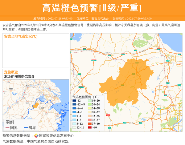 安吉县气象台2022年7月28日9时33分发布高温橙色预警信号:受副热带高压影响,预计今天我县所有镇(乡、街道)最高气温可达38℃左右,请做好防暑降温工作。 信息来源:国家预警信息发布中心; 发布单位:安吉县气象台。