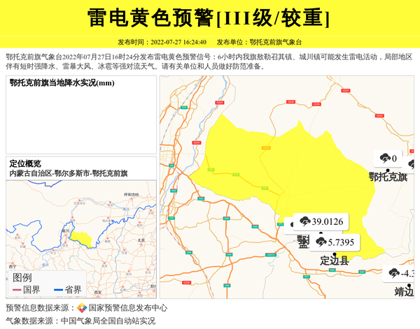 鄂托克前旗气象台2022年07月27日16时24分发布雷电黄色预警信号:6小时内我旗敖勒召其镇、城川镇可能发生雷电活动,局部地区伴有短时强降水、雷暴大风、冰雹等强对流天气。请有关单位和人员做好防范准备。 信息来源:国家预警信息发布中心; 发布单位:鄂托克前旗气象台。