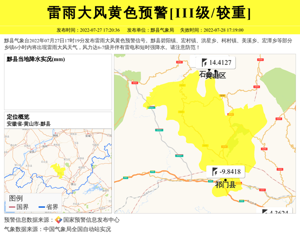 黟县气象局发布雷雨大风黄色预警[III级/较重]