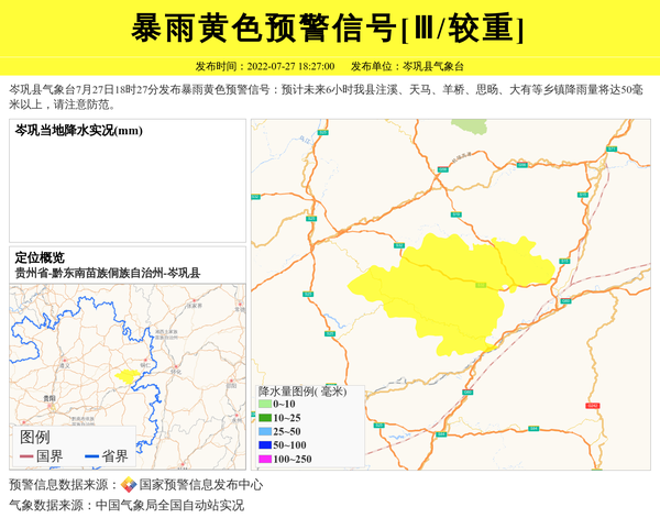 岑巩县气象台7月27日18时27分发布暴雨黄色预警信号:预计未来6小时我县注溪、天马、羊桥、思旸、大有等乡镇降雨量将达50毫米以上,请注意防范。 信息来源:国家预警信息发布中心; 发布单位:岑巩县气象台。