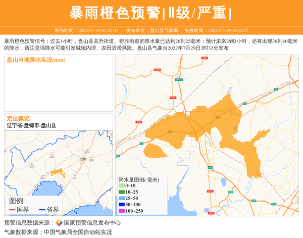 暴雨橙色预警信号:过去1小时,盘山县高升街道、得胜街道的降水量已达到20到25毫米;预计未来2到3小时,还将出现30到40毫米的降水,请注意强降水可能引发城镇内涝、农田渍涝风险。盘山县气象台2022年7月29日2时33分发布 信息来源:国家预警信息发布中心; 发布单位:盘山县气象局。