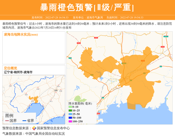 暴雨橙色预警信号:过去1小时,凌海市的降水量已达到10到30毫米;预计未来2到3小时,还将出现30到50毫米的降水,请注意防范城市内涝。凌海市气象台2022年7月28日16时51分发布 信息来源:国家预警信息发布中心; 发布单位:凌海市气象局。
