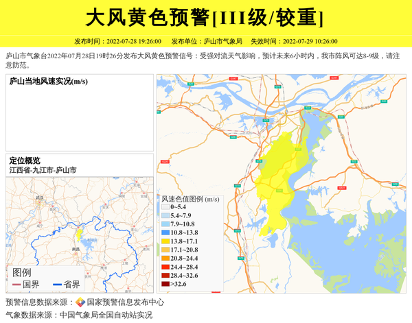 庐山市气象台2022年07月28日19时26分发布大风黄色预警信号:受强对流天气影响,预计未来6小时内,我市阵风可达8-9级,请注意防范。 信息来源:国家预警信息发布中心; 发布单位:庐山市气象局。