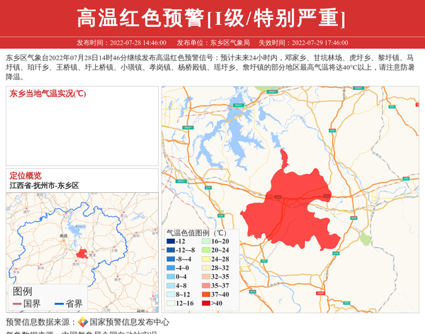 东乡区气象台2022年07月28日14时46分继续发布高温红色预警信号:预计未来24小时内,邓家乡、甘坑林场、虎圩乡、黎圩镇、马圩镇、珀玕乡、王桥镇、圩上桥镇、小璜镇、孝岗镇、杨桥殿镇、瑶圩乡、詹圩镇的部分地区最高气温将达40°C以上,请注意防暑降温。 信息来源:国家预警信息发布中心; 发布单位:东乡区气象局。