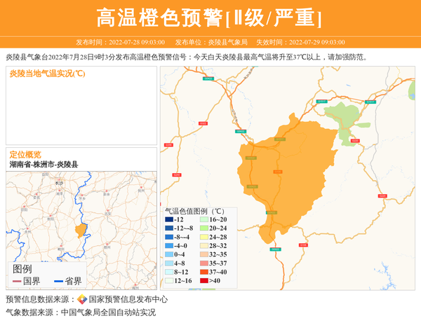 炎陵县气象台2022年7月28日9时3分发布高温橙色预警信号:今天白天炎陵县最高气温将升至37℃以上,请加强防范。 信息来源:国家预警信息发布中心; 发布单位:炎陵县气象局。