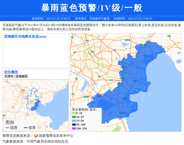 滨海新区气象台于2022年07月28日15时35分继续发布暴雨蓝色预警信号:预计未来6小时内滨海新区(寨上街道,茶淀街道,汉沽街道,杨家泊镇)降雨量将达50毫米以上,请有关单位和人员作好防范准备。 信息来源:国家预警信息发布中心; 发布单位:滨海新区气象局。
