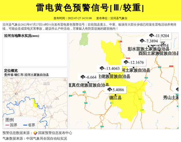沿河县气象台2022年07月27日14时51分发布雷电黄色预警信号:目前我县黄土、中寨、板场等大部分乡镇已经发生雷电活动并将持续,可能会造成雷电灾害事故,建议停止户外活动,尽量躲入有防雷设施的建筑物内! 信息来源:国家预警信息发布中心; 发布单位:沿河县气象台。
