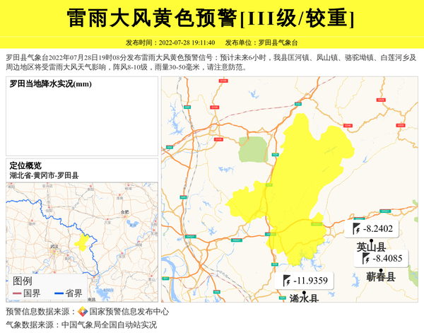 罗田县气象台2022年07月28日19时08分发布雷雨大风黄色预警信号:预计未来6小时,我县匡河镇、凤山镇、骆驼坳镇、白莲河乡及周边地区将受雷雨大风天气影响,阵风8-10级,雨量30-50毫米,请注意防范。 信息来源:国家预警信息发布中心; 发布单位:罗田县气象台。