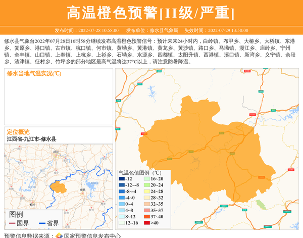 修水县气象台2022年07月28日10时58分继续发布高温橙色预警信号:预计未来24小时内,白岭镇、布甲乡、大椿乡、大桥镇、东港乡、复原乡、港口镇、古市镇、杭口镇、何市镇、黄坳乡、黄港镇、黄龙乡、黄沙镇、路口乡、马坳镇、漫江乡、庙岭乡、宁州镇、全丰镇、山口镇、上奉镇、上杭乡、上衫乡、石坳乡、水源乡、四都镇、太阳升镇、西港镇、溪口镇、新湾乡、义宁镇、余段乡、渣津镇、征村乡、竹坪乡的部分地区最高气温将达37°C以上,请注意防暑降温。 信息来源:国家预警信息发布中心; 发布单位:修水县气象局。