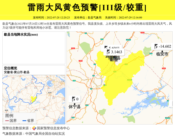 歙县气象台2022年07月28日12时16分发布雷雨大风黄色预警信号。我县溪头镇、上丰乡等乡镇未来6小时内将出现雷雨大风天气,风力达7级并可能伴有雷电和局地小冰雹。请注意防范! 信息来源:国家预警信息发布中心; 发布单位:歙县气象局。