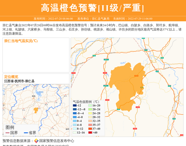 崇仁县气象台2022年07月28日08时06分发布高温橙色预警信号:预计未来24小时内,巴山镇、白陂乡、白路乡、郭圩乡、航埠镇、河上镇、礼陂镇、六家桥乡、马鞍镇、三山乡、石庄乡、孙坊镇、桃源乡、相山镇、许坊乡的部分地区最高气温将达37°C以上,请注意防暑降温。 信息来源:国家预警信息发布中心; 发布单位:崇仁县气象局。